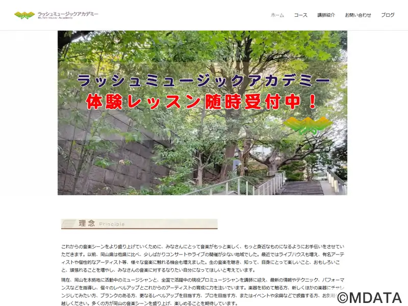 岡山に拠点を置く音楽スクール。初心者からプロを目指す方まで幅広いレベルを対象に、 ピアノ、バイオリン、ギター、ベース、ドラム、ボーカル、管楽器、パーカッションなど多彩なコースを開講。地元や全国で活躍するプロミュージシャンを講師に迎え、最新のテクニック、パフォーマンスを個人レッスンで指導。子供の成長の一環として、豊かな感性を養う。年に一度の発表会も開催し、音楽を楽しむためのサポートが充実している。