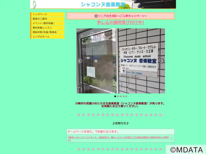神奈川県川崎市の武蔵小杉にある音楽教室。34年以上の歴史を持ち、ピアノ、声楽、フルート、ギター(クラシック・フォーク・ウクレレ)、バイオリンなど幅広い楽器のレッスンを提供。3歳から80代までの生徒が通い、一人ひとりの目標やレベルに合わせた丁寧な指導が特徴のアットホームな教室。未経験者から経験者まで、音楽の楽しさを実感できる環境が整っています。レッスン時の楽器レンタルや、持ち帰りできる楽器貸出もあり。