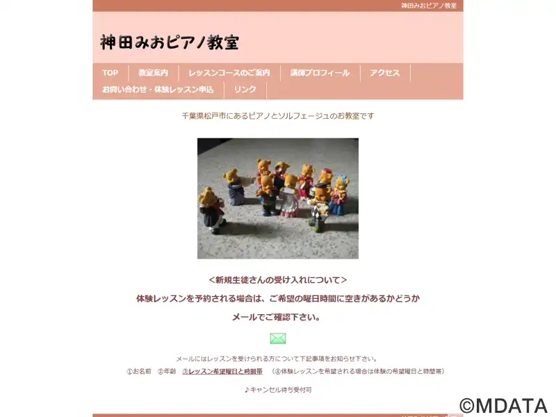千葉県松戸市を中心にピアノ演奏活動を行う神田美緒(国立音楽大学ピアノ科卒)の運営するピアノ・ソルフェージュ教室。広いレッスンルームで、音の響きを感じながらのゆったりとしたレッスンが行われる。小さな子供同伴でのレッスンも可能。レッスンコースはレギュラーコースと、音高、音大受験やコンクールグレード習得を目標とする人向けの専門コースがあり、ミニコンサートやサロンコンサートも行われる。定期的に発表会を開催。