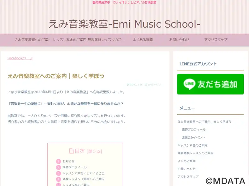 静岡県焼津市にある、バイオリンとピアノの音楽教室。2023年4月から「こはり音楽教室」から「えみ音楽教室」に教室名を変更。当教室は、子どもから大人まで幅広い年代の方々を対象に、初めて楽器を習う方、昔習っていて再開したい方など、それぞれに合わせた楽しいレッスンを提供。音楽が一生の友達になれるよう、しっかりとした基礎を習得し、クラシックからポピュラーまでお気に入りの曲にチャレンジすることができる。