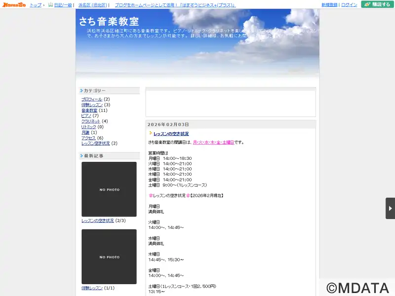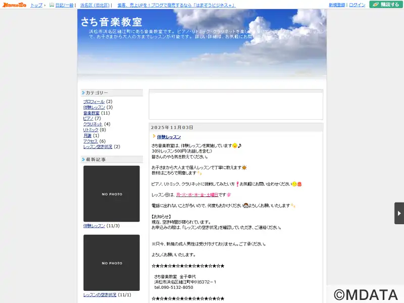 静岡県浜松市細江町にある音楽スクール。ピアノ、オルガン、リトミック、クラリネットのレッスンを提供。子供から大人まで幅広い年齢層に対応している。個人レッスン形式で、ジャンルを問わず、和音の勉強や曲のアレンジができるコースを用意。結婚式や忘年会など特別な機会のための演奏が習得できる大人の女性向けの「1曲マスターコース」など、ニーズに合わせたレッスンや教材を用意し、音楽を通じて素敵な体験を提供している。