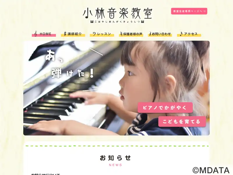 帯広市で2001年に開講したピアノ教室。多くの指導者賞受賞経歴のある小林梨香氏が主宰する。ピアノ、声楽、リトミック、ソルフェージュなどを中心に丁寧に指導している。選択できるレッスン形式は個人とグループで、対象年齢はピアノが2歳半から、声楽が中学生から、リトミックがマタニティからと幅広く対応している。また、大人のためのレッスン、障がい児の音楽療育、音大受験やコンクール対策のアドバイスレッスンも提供。