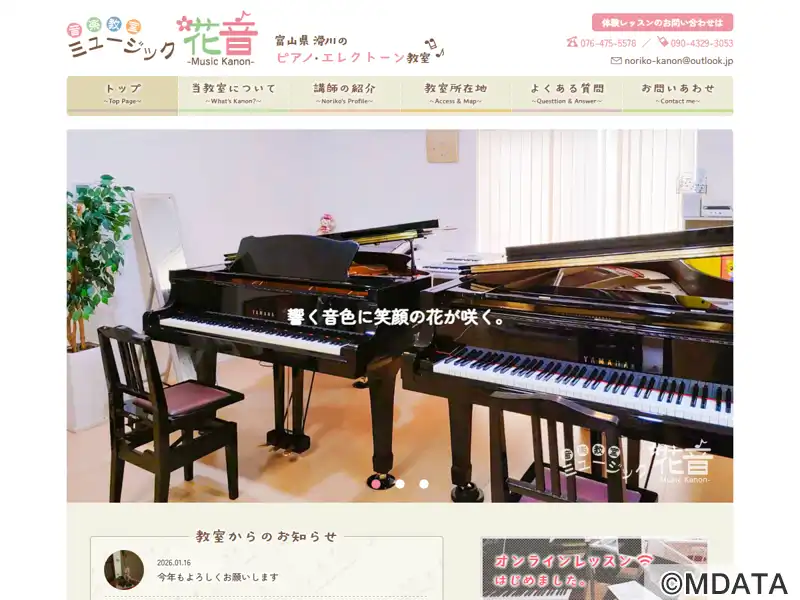 富山県滑川市にあるピアノとエレクトーンの教室。「のびのび楽しく」をモットーに、演奏技術とともに、歌う、聴く、リズムを叩く、楽譜の読み方やアンサンブル、リトミックなどを取り入れた生徒に合わせたレッスンを行う。平日は夜9時まで、土日のレッスンも選べる通いやすいレッスン体制が特徴。ヤマハグレードを取得も可能。毎年恒例の発表会や、ピアノコンクール、エレクトーンステージなどのイベントも開催する。