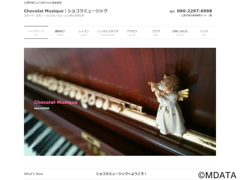 広島市南区にあるフルート、ピアノ、ソルフェージュの音楽教室。音楽大学大学院で優秀な成績を収めた講師が、趣味から音楽大学を目指す方まで、年齢や経験を問わず幅広いレッスンを行う。アンサンブルや連弾のレッスンもあり、フリータイム予約制でレッスン日を調整できる。フルート、ピアノの体験レッスンも可能。貸出用の楽器を用意してある。年に1回ショコラ音楽会を開催。練習用のレンタルスタジオもあり、個人や商業利用もできる。