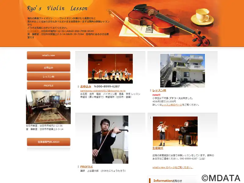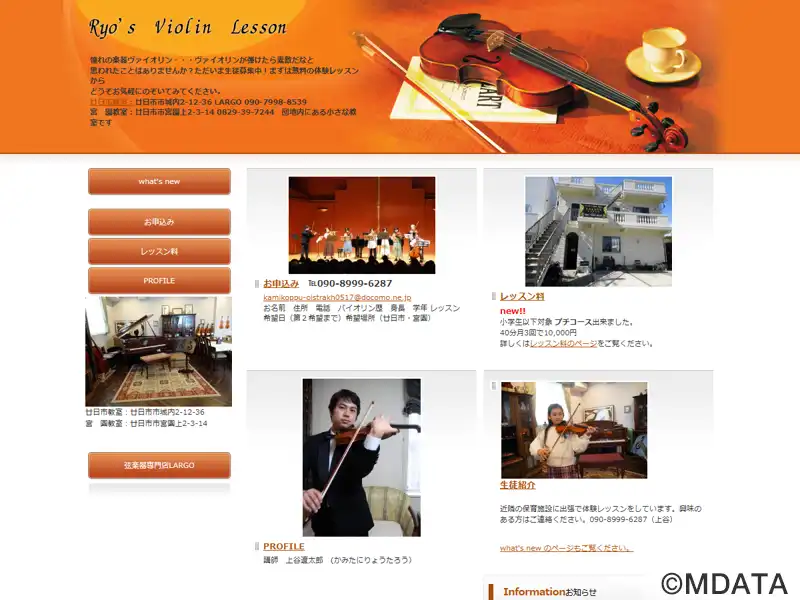 広島県廿日市市にあるヴァイオリン教室。ヴァイオリニストの上谷遼太郎氏(エリザベト音楽大学大学院修士課程修了)が指導する。初心者から上級者まで、様々な年齢や経験レベルの生徒を対象に、各個人のレベルと目標に対応したレッスンを提供する。スケジュールも、生徒の都合に合わせて調整できる。月に一度、合奏の練習も行っており、さらに教室では発表会やコンクールへの積極的な参加を通じて、多様な音楽学習の機会を提供する。
