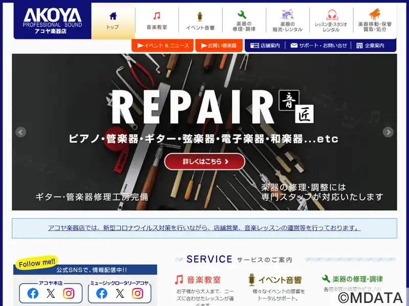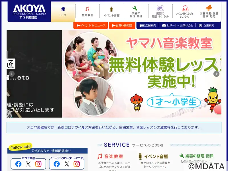 アコヤ楽器店(本店・ロータリー店)の音楽教室は、こどものヤマハ音楽教室をはじめ、ピアノ・エレクトーン、そしてフルート・サクソフォン、トランペットなど管楽器。ギター(エレキ・フォーク・クラシック)、エレキベース、ドラム、ボーカル、バイオリンなどバラエティに富むレッスンを展開。演奏経験がなくても安心して楽しく始めていただけます。まずは体験レッスンを受けてみてください。