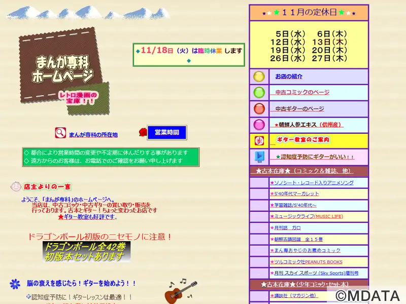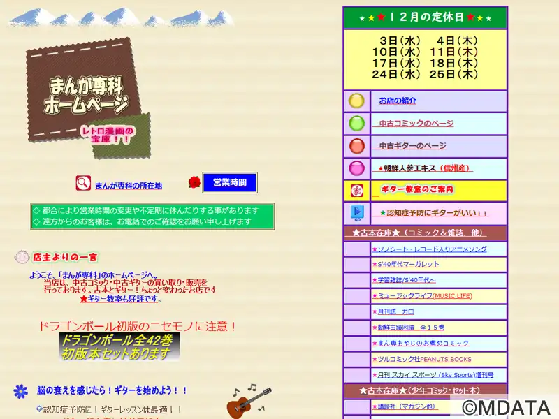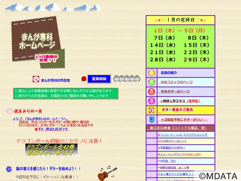 1984年に長野東御国道18号沿いに開業した、中古コミックと中古ギター専門店内で開講されているギター教室。フォークギター、エレキギター、弾き語りなどのレッスンを行っており、小学2年生からシニアの方まで、それぞれに合わせた個人レッスンを提供している。教室は月謝制ではなく、30分1,500円で、自分の都合の良い時間にレッスンが受けられるため、自分のペースで通うことができる。貸しギターも用意されている。