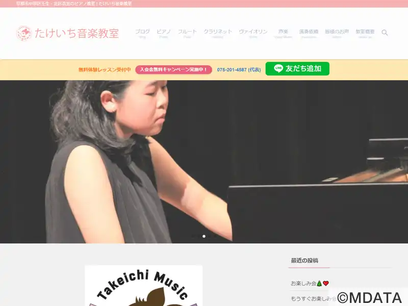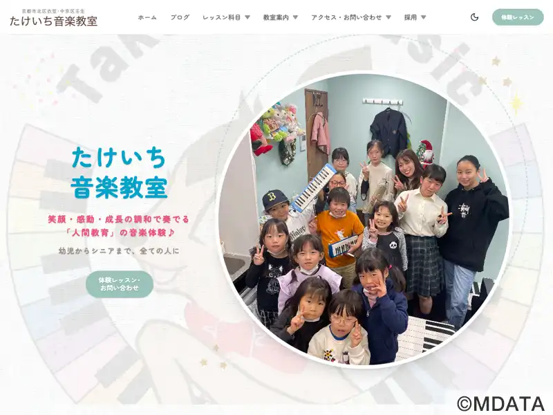 京都市中京区・北区に拠点を持つアットホームな音楽教室。ピアノ、ヴァイオリン、フルート、クラリネット、声楽の個人レッスンで、幼児からシニアまで幅広い年齢層に対応。教室の理念である「笑顔」「感動」「成長」を大切にし、音楽を通じて夢や希望、生きがいを届けることを目指す。すべての人が音楽の楽しさを共有できるよう、親身な指導に取り組んでいる。また、発表会や地域活動を通じて成長をサポートする場も提供している。
