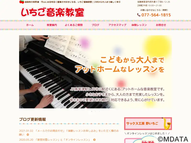 滋賀県草津市のJR南草津駅から徒歩7分ピースタウンにあるアットホームな音楽教室。3歳から大人まで、初心者から経験者まで幅広く対応し、ピアノ、エレクトーン、フルート、ギター、ドラム、ベース、ウクレレ、ボーカル、バイオリン、サックスなど多彩な楽器の個人レッスンを行う。クラシック、ジャズ、Jポップなど多様なジャンルに対応し、バンド演奏やアンサンブルも楽しめる。オンラインレッスンにも対応で自宅でも学べる。