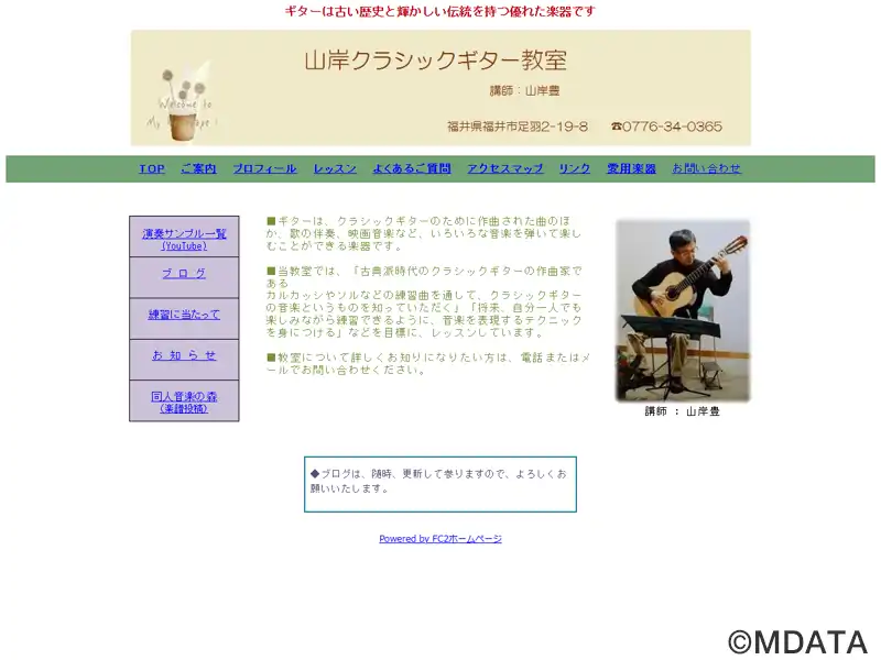 福井市にあるクラシックギターの正しい弾き方を学ぶための教室。古典派時代のクラシックギターの作曲家であるカルカッシやソルなどの練習曲を通して、クラシックギターの音楽を追求する。レッスンは、生徒と講師の一対一の個人レッスン形式。楽譜が全く読めない方や、初めて楽器を始める人にも丁寧に指導する。毎年、発表会を開催。将来的には、自分自身による練習を重ねることで、音楽表現を磨いていけるテクニックの習得を目指す。