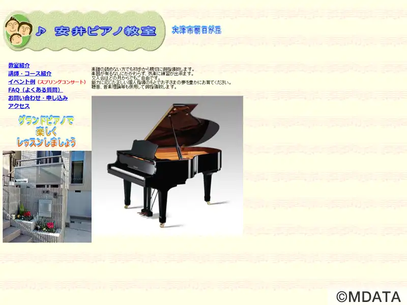 大津市朝日が丘にあるピアノ教室。窓から琵琶湖が見える階の教室で、グランドピアノYAMAHA C7を使ったレッスンが行われる。幼児から大人、シニアまで、楽譜の読めない方やピアノを持っていない方でも親切に初歩から指導する。能力に応じた個人指導のもと、子供の夢を豊かに育てる。聴音や音楽理論も併用したレッスンで、振り替えレッスンも可能。毎年、琵琶湖ホール小ホールなどで合同発表会を開催している。