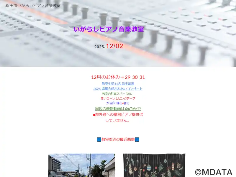秋田市旭北栄町のピアノ教室です。3才児から趣味で習いたい大人の方まで、長年の経験を生かした親切な指導をしています。保育士試験のためのバイエル・弾き歌い・コールユーブンゲンなども受講可能。ソルフェージュや楽典も指導いたします。他教室からの転入もお引受けいたします。時間変更や振替レッスンなど柔軟に対応。グランドピアノ常設レッスン室が2部屋あり、レッスンが楽しくなるユニークなサービスも行っています。会報「きらら」毎週発信。