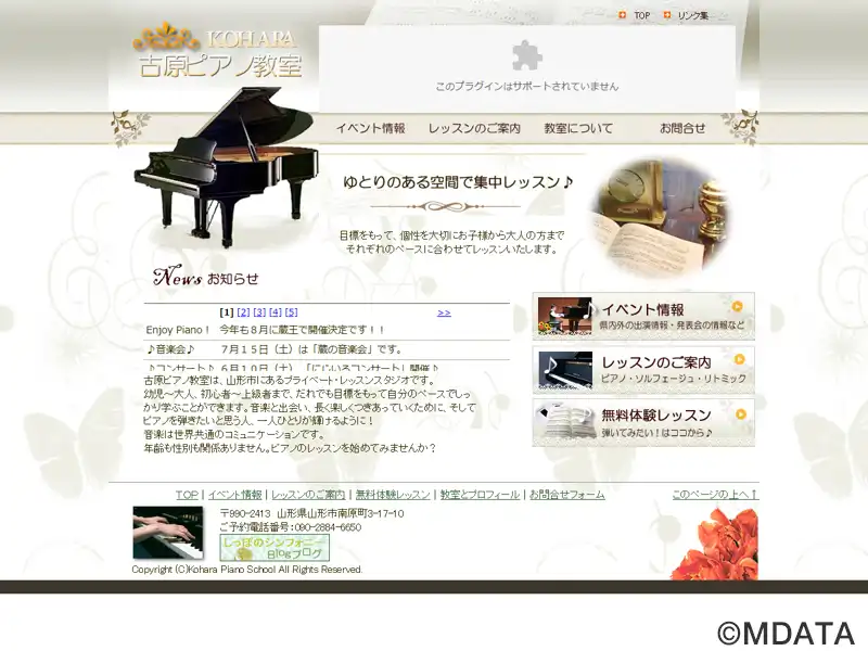 山形市にある、古原佳奈氏(武蔵野音楽大学ピアノ専修)が指導するピアノ教室。リラックスした雰囲気のプライベートレッスンスタジオで、幼児から大人、初心者から上級者まで、目標を持って自分のペースでピアノを学ぶことができる。月謝制と1レッスン制があり、クラシック・ポピュラーのピアノ、ソルフェージュなど、リトミックや創作、音楽高校・音楽大学受験対策にも対応する。また、山形市や上山市などでの出張レッスンも行う。