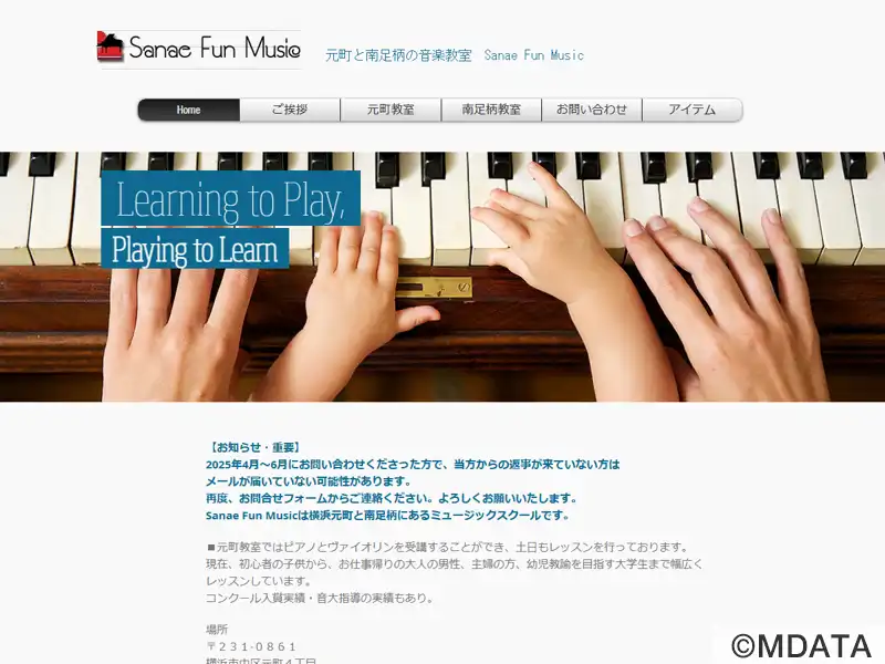 神奈川県の横浜中区元町と南足柄市にあるミュージックスクール。「ひとりひとりの個性を尊重し、丁寧に・ゆったりとレッスンすることができる教室」を掲げ、子どもの個性を大事にするレッスンを行う。ピアノとヴァイオリン(元町教室のみ)コースを開講。子供から、初心者、社会人の方、主婦の方、幼児教諭を目指す大学生まで幅広くレッスンを行う。コンクール入賞実績や音大指導の実績もあり。レッスン用のバイオリンレンタルも行う。