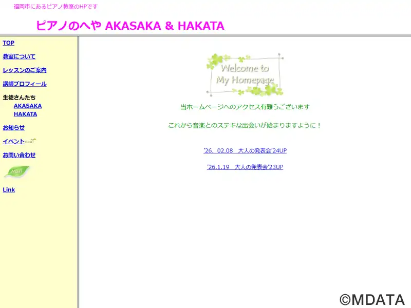 福岡市の中央区赤坂と博多区にレッスン室のあるピアノ教室。愛情溢れる細やかなレッスンを行う。幼児期には、耳慣れた曲を弾いて楽しみながら、基本的なマナーや譜読み、リズムを学ぶい、小学生は基礎力をしっかり付け、身近な目標を定め、学校での演奏などを楽しめるようにする。中学生は、忙しい時期でもピアノを続ける工夫をし、音楽の専門家を目指す方は具体的な方向を決める。大人の方には、弾きたい曲が必ず弾けるレッスンを行う。