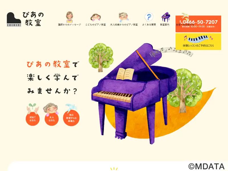 藤沢市を中心に3つのレッスン会場を運営するピアノ教室。子供から大人まで幅広い年齢層を対象に、音楽やピアノに初めて接する人に向けた指導を得意としている。子供のピアノレッスンでは、リトミックを取り入れながら、楽しいレッスンを行う。大人向けのピアノレッスンでは、弾きたい曲を教材に、レベルに応じたレッスンを行う。結婚式やパーティーなどで演奏するための短期間習得も可能。藤沢市、鵠沼、片瀬、寒川地域を対象とする。