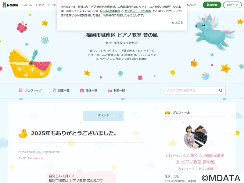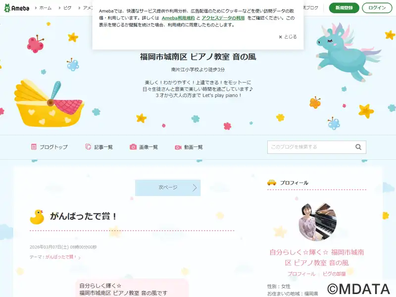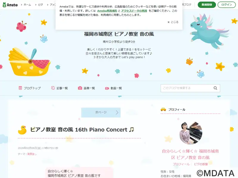 福岡市城南区にあるピアノ教室。3歳からシニアまで幅広い年齢層を対象に、一人ひとりの個性や目標に応じた指導を行っている。幼児にはリトミック、小学生以上にはソルフェージュを取り入れたレッスンで、音楽の楽しさと豊かな表現力を育みます。大人向けには、趣味のコースのほか、保育士・教員を目指す方や音大受験を目指す専門コースも用意している。1年に一回発表会を開催し、生徒たちが日頃の成果を発表する機会を設けている。