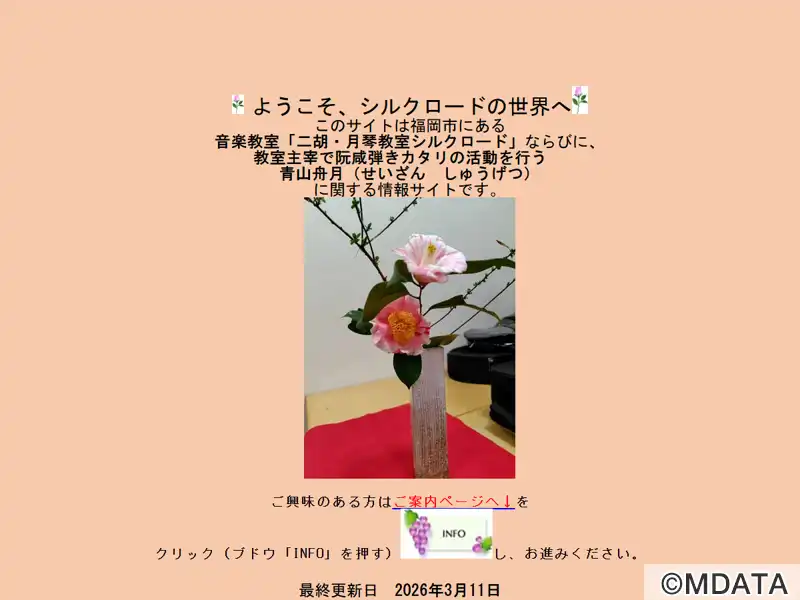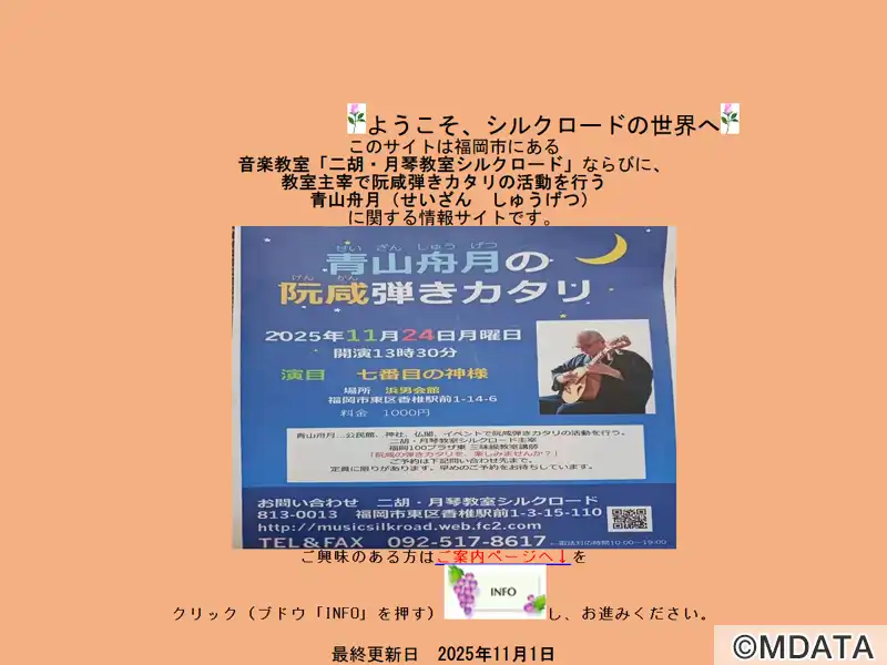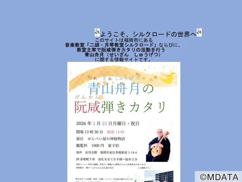 福岡市にある、青山舟月が主宰する初心者を対象にした二胡・月琴教室。青山流のオリジナル奏法による月琴レッスンと、女性講師による二胡レッスンがあり、二胡、月琴ともに日本人講師による予約制の個人レッスンを提供。また、月のテーマに応じて、さまざまな音楽文化や理論について学べる音楽講座も開催。入会後1ヶ月間は二胡・月琴を貸し出し無料。教室はJR鹿児島本線沿い、県道504号に面したマンション1階にある。