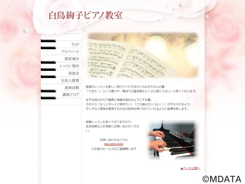 千葉県市原市で演奏活動を行っている白鳥絢子(武蔵野音楽大学ピアノ専攻)が指導するピアノ教室。大人のためのピアノコース、受験コース、ソルフェージュ、楽典などのレッスンを行う。レッスンを楽しく続けていけることを目標に、もっとキレイに弾きたい、この曲はカッコよく、など、思い通りの表現するための技術を身に付けるレッスンを行う。レッスン室には、豊富な楽譜や、2台のグランドピアノ(ヤマハC5・C3)が用意されている。