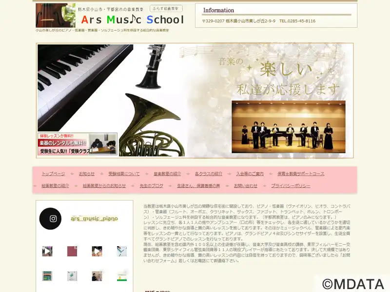 栃木県小山市にある総合音楽スクール。ピアノ、弦楽器、管楽器、声楽、ソルフェージュなどのレッスンを開講。初心者から音大・音高受験生まで幅広く対応。音楽大学の講師や現役楽団奏者が在籍し、個々の目標に合わせた指導を行う。ソルフェージュでは聴音、視唱、和声学、音楽理論までカバー。ピアノクラスではグレード取得やコンクール参加をサポートし、発表会ではソロ、連弾、アンサンブル、ミュージックベルの演奏機会もあり。
