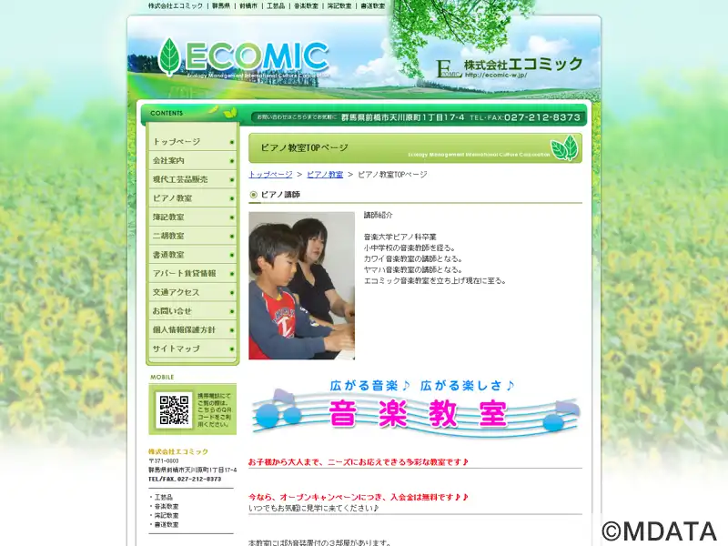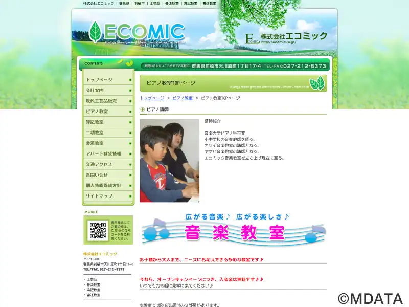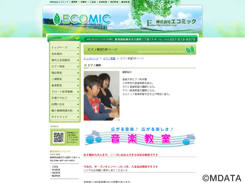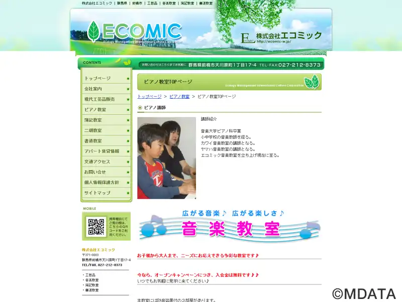 群馬県前橋市で現代工芸品販売や、国際的な学問・文学・美術スクール事業を行う株式会社エコミックが運営する、2007年設立の音楽教室。ピアノ科、サクスフォン科・フルート科・ドラム科、二胡教室(個人・グループ)など開講。初心者から大人まで、希望の時間に合わせたマンツーマンの個人レッスンで、幅広いニーズに対応。音大受験の指導も対応しており、ソルフェージュ指導も行っている。ピアノ練習室の貸出も行う。
