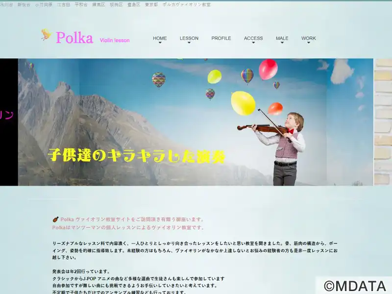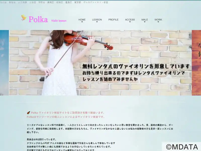 東京都練馬区にあるヴァイオリン専門の教室。アットホームな雰囲気の中、未経験者から経験者、子供からシニア世代までを対象に、マンツーマンレッスンを行なっている。骨や筋肉の構造に基づいた姿勢矯正から、ビブラートやボーイングなど実践的な演奏技術まで幅広く指導する。年2回の発表会を通じて、クラシックからJ-POP、アニメの曲まで多様なジャンルの演奏を楽しむ機会も提供する。レンタルヴァイオリンも用意されている。