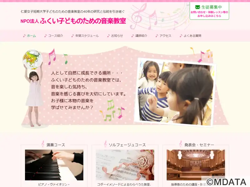 福井市にある子供向けの音楽教室で、ピアノ、ヴァイオリン、フルートなどの楽器演奏を中心に、ソルフェージュコースやコーラス、個人ソルフェージュなど多彩なプログラムを提供する。わらべうた遊びを通じてリズムや音程感覚の基礎を学び、年齢別のクラスや個人レッスンで、一人一人の個性や段階に応じた指導を行う。また、発表会やコンサート、セミナーなど、音楽の世界に深く触れる機会を提供。コンクール入賞者も輩出している。