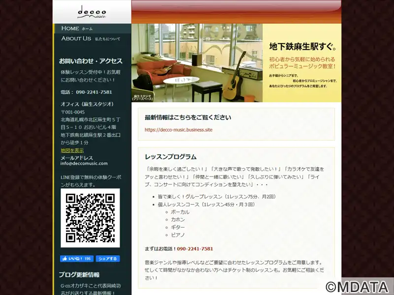札幌市の地下鉄麻生駅から徒歩1分に位置する、地域に根ざしたポピュラー・ミュージック教室。子供からシニアまで、初心者からプロを目指す人まで対応。ボーカル、ギター、ピアノ、カホンの個人レッスンやグループレッスンを提供。幼児向けクラスやチケット制レッスンも。レコーディングは防音ブースと高品質機材を使用し、バンドやオーディション、記念録音、出張録音に対応。音楽制作では作曲やアレンジ、ジングル制作なども行う。