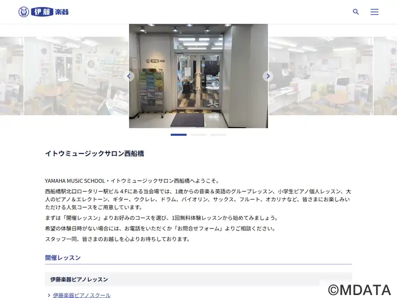 船橋市の西船橋駅から徒歩1分に位置する伊藤楽器のレッスンセンター。地域に愛される教室を目指す。ピアノ、管楽器、バイオリン、ギター、ベース、ドラム、ボーカルなど、多数のコースを用意。オリジナルのピアノ個人レッスンや、ヤマハ認定講師による子供のための「ヤマハ音楽教室・英語教室」、さらに大人向けの「ヤマハミュージックレッスン」を開講している。初心者から経験者まで、年齢に関係なく楽しく始めることができる。
