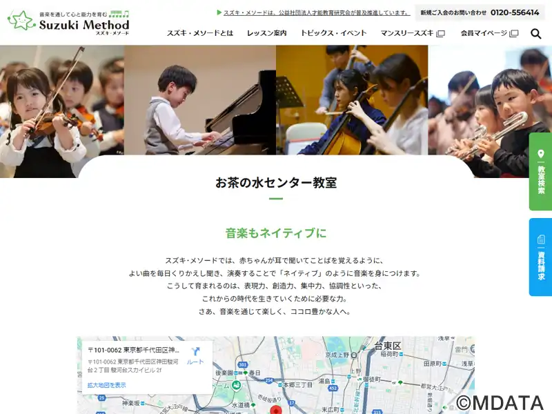 千代田区神田駿河台にあるスズキ・メソードの音楽教室。お茶の水センター教室では、ヴァイオリン科、チェロ科、フルート科、ピアノ科を開講している。母語の教育法をもとに音楽を通じて豊かに心を育て、ひとりひとりに合わせた個人レッスンを提供している。複数の講師が在籍しており、大人のスズキ(大人向けクラス)受け入れやヴィオラ指導も対応可能。また、合奏やコンサートなどの演奏機会も豊富に設けている。