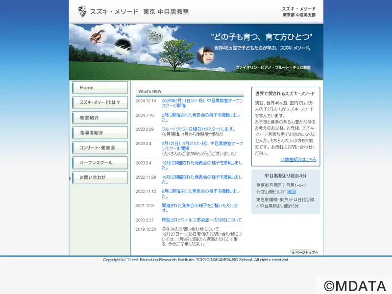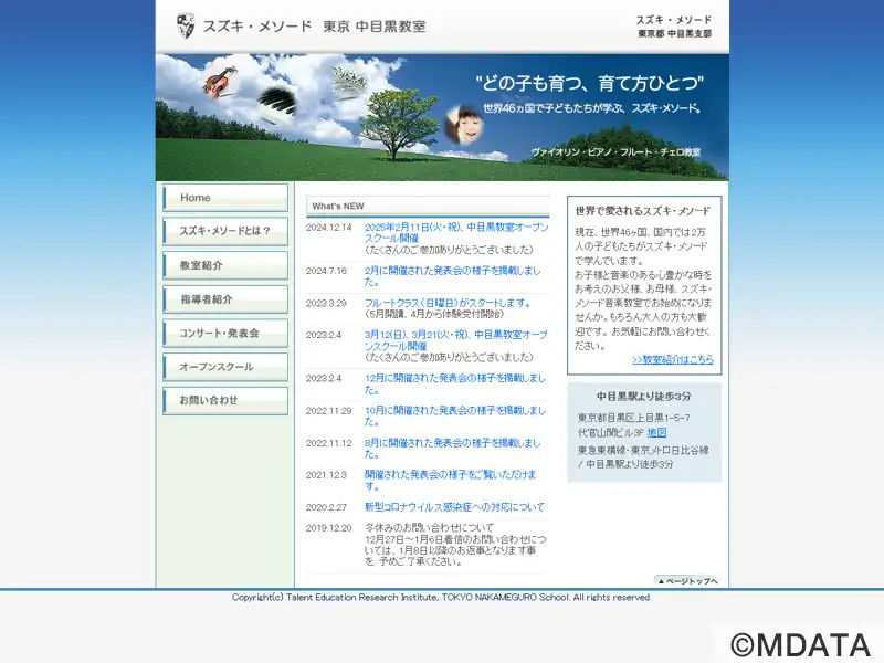 東京目黒区の中目黒駅より徒歩3分に位置するスズキ・メソードのレッスンセンター。ピアノ、ヴァイオリン、フルート、チェロの各科を開講し、幼児から大人まで幅広い年齢層が学んでいる。スズキ・メソードの理念「母語のように音楽を学ぶ」に基づき、日々の練習や演奏体験を通して、音楽だけでなく豊かな人間性や自己表現力も育成。個人レッスンに加え、グループレッスンやアンサンブルの機会もあり、発表会やコンサートも開催。