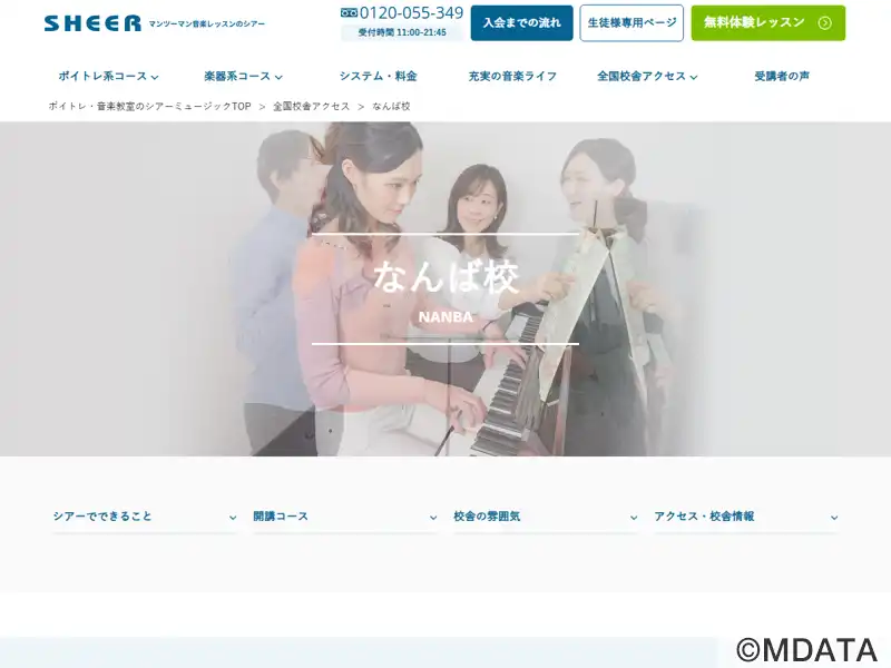 大阪市中央区西心斎橋にあるシアーミュージックのなんば校。好きな時間や曜日、講師も選べるマンツーマンレッスン。趣味からプロのスキルまで、多種のジャンルに対応。自分のペースで通って効率的に上達することができる。個人カルテシステムで上達をサポートする。ボーカル、ボイストレーニング、ピアノ、ギター、ベース、ドラム、DTMコースなどが開講され、複数コースの受講や、練習室のレンタルも可能。なんば駅から徒歩7分。