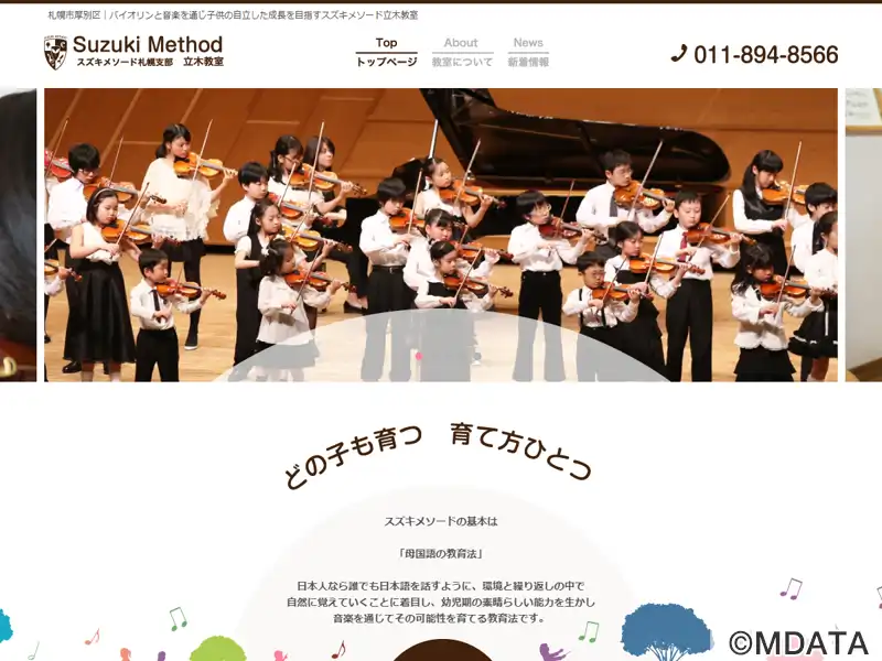 札幌市厚別区にあるスズキ・メソードの音楽教室。「母国語を覚えるように音楽を学ぶ」独自の教育法を実践し、子ども・親・講師が三位一体となって信頼関係を築きながらヴァイオリンを学ぶ。2~3才から、小さいサイズの楽器で無理なくスタート。個人とグループのレッスンを通じ、忍耐力や自信、協調性を育む。アットホームな環境で、講師の立木里恵氏が創始者・鈴木鎮一から学んだ経験を活かし、技術と人間性を両立した指導を行う。