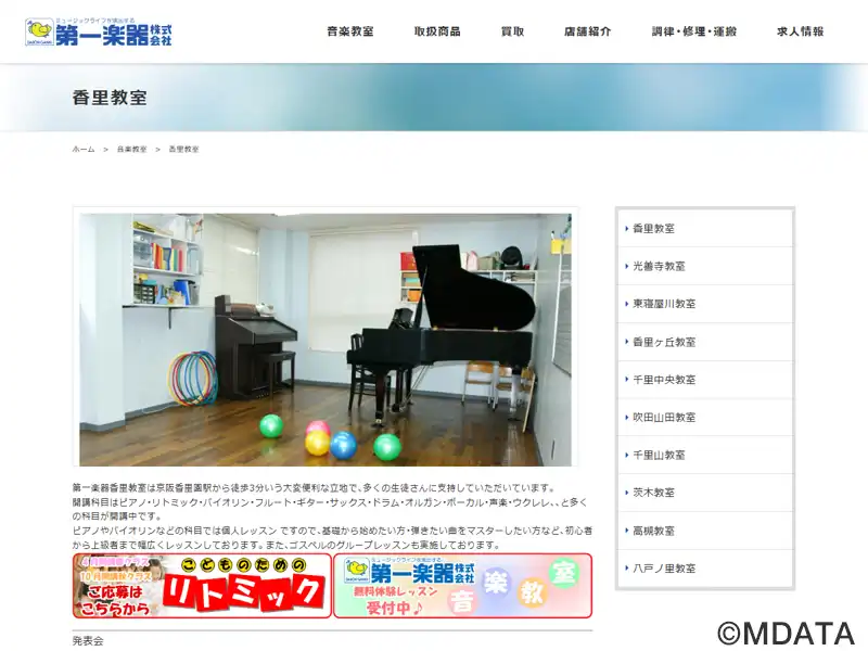 京阪香里園駅から徒歩3分の場所にある、第一楽器が運営するレッスンセンター。ピアノ、バイオリン、フルート、ギター、サックス、ドラム、オルガン、ボーカル、声楽、ウクレレ、リトミックなど様々なコースを開講。春から秋にかけて、数回の発表会があり、練習の成果を披露できる。1階には楽器販売フロアがあり、ピアノや電子ピアノを多数展示販売しているので、楽器を購入したい場合にも、丁寧なアドバイスとサポートが受けられる。