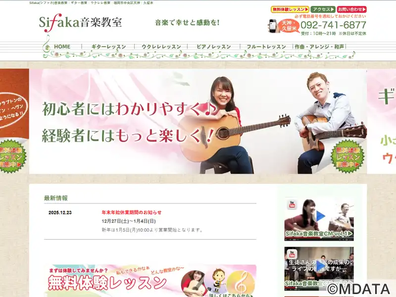 福岡市天神と久留米市でレッスンを行う音楽教室。初心者から上級者まで、一人ひとりのレベルに合わせた個人レッスンを提供。ギター、ウクレレ、ピアノ、フルート、オカリナといった楽器レッスンに加え、作曲・アレンジ・和声、音大受験対策、ソルフェージュ、英国王立音楽検定など、専門的なコースも開講。経験豊富な講師陣が指導にあたり、小学生から大人まで幅広い年齢層が通う。これまでに1,000人以上のレッスン実績を持つ。