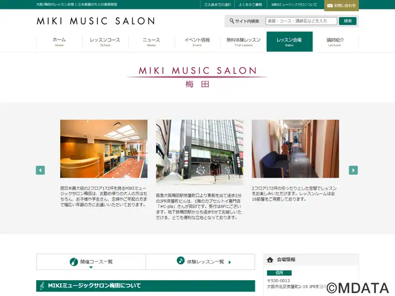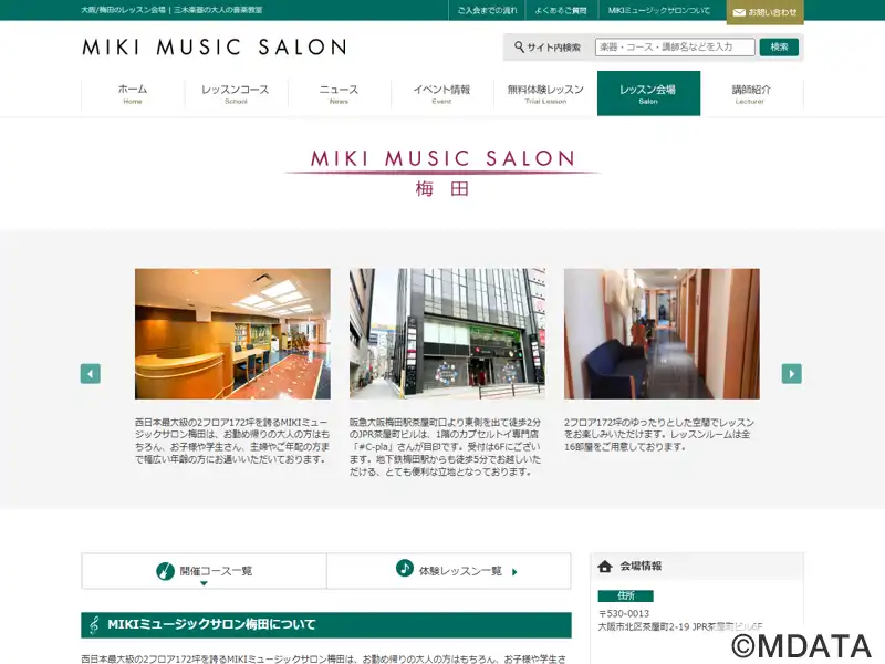 大阪梅田駅近くにある、三木楽器が運営する西日本最大級の音楽教室。全2フロア172坪に広がる16のレッスンルームを有し、子供からシニア世代まで約1,500名の生徒が在籍する。バンド系からピアノ、ハープ、ボーカル、作曲まで多岐にわたる40コースを提供。大人数アンサンブルやグループレッスンも充実しており、幅広い年代の音楽仲間と交流できる。全コースで楽器レンタル可能で、手ぶらで参加できるクラスも用意している。