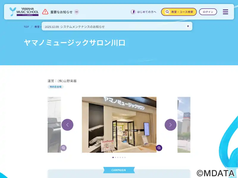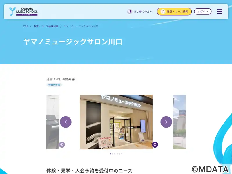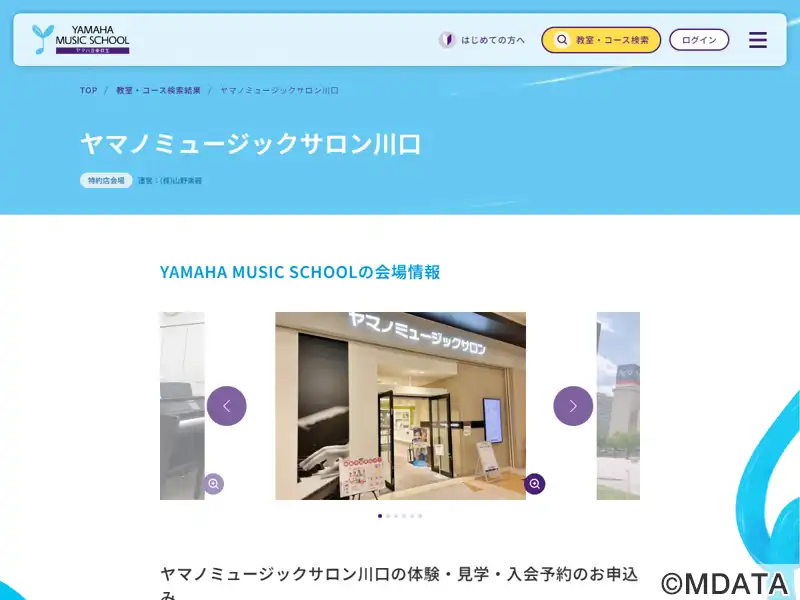 アリオ川口3Fに2021年5月リニューアルオープン(そごう川口店8Fから移転)。11のレッスンルームとラウンジを完備。ショッピングモール内でお買い物ついでや会社帰りにも便利。ピアノ、ヴァイオリン、ギター、ウクレレ、フルート、サックス、ヴォーカルなど、お子さまからシニアの方まで、幅広い年代の方が楽しめる多彩なジャンルのコースをご用意。駐車場1,700台。