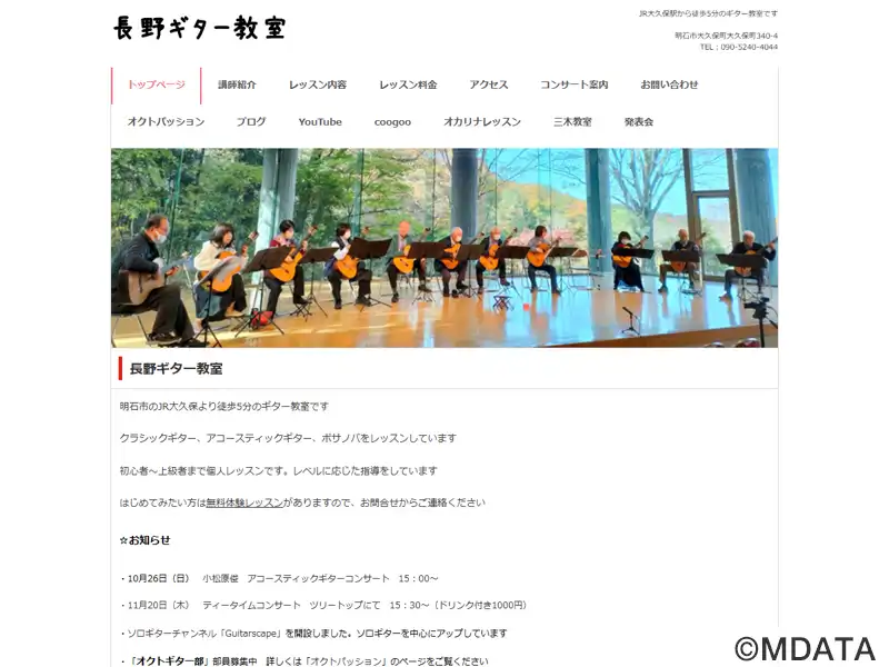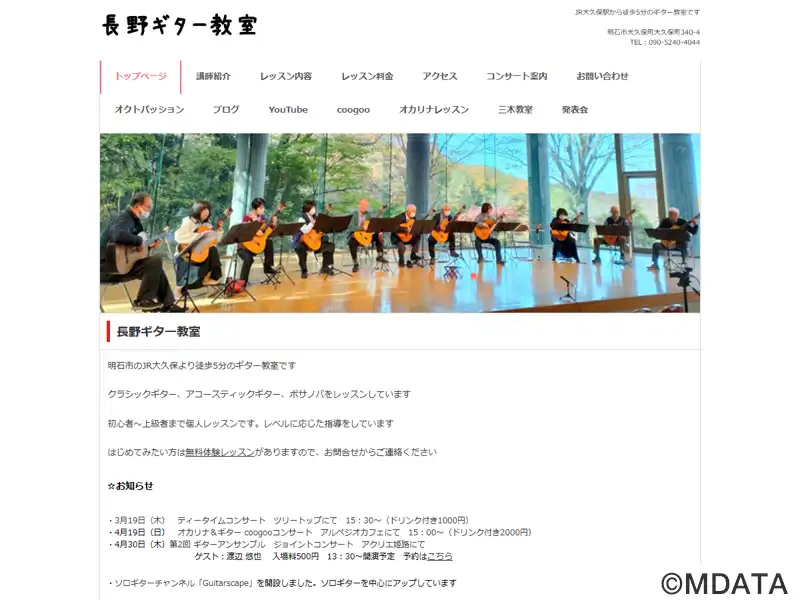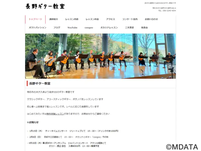 兵庫県明石市のJR大久保駅から徒歩5分にある、ギタリスト長野武氏が指導するクラシックギター教室。主なレッスン内容として、クラシックギター初心者向けに教本による基礎指導、経験者は持参曲でのレッスン、弾き語りでは、コードやリズムなどの技術指導から、上達に応じて楽譜の読み方なども教える。そのほか、フラメンコギターや、音楽理論も学べる。生徒のレベルやペースに合わせて指導し、個性に応じたメニューを提供する。