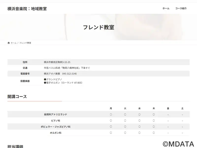 横浜市鶴見にある横浜アオバ楽器のレッスンセンター。ローランド音楽教室の認定講師によるリトミック、クラシックピアノ、ポピュラーピアノ、電子オルガンコースを開講している。伝統的なレッスンの手法に、電子楽器の先進性を効果的に取り入れた新しい音楽教育で、楽しく音楽の基礎を身に付け、一人ひとりの感性や技術、表現力を育成する。グランドピアノを使用したピアノ個人レッスンを行う。市営バス13系統駒岡八幡神社前下車。