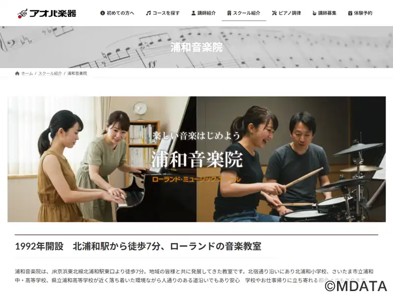 さいたま市の北浦和駅から徒歩7分の場所に1992年に開設された、アオバ楽器が運営する音楽教室。1歳半からのリトミックコースをはじめ、クラシックピアノ、ポピュラーピアノ、ジャズピアノ、オルガン、ドラムのレッスンを提供している。情操教育から趣味、大人の生涯学習や講師養成コースまで、個々のニーズに合わせたレッスンを行い、音楽ライフをサポート。講師陣はコンクールで優れた成績を収めた音大卒生で構成されている。