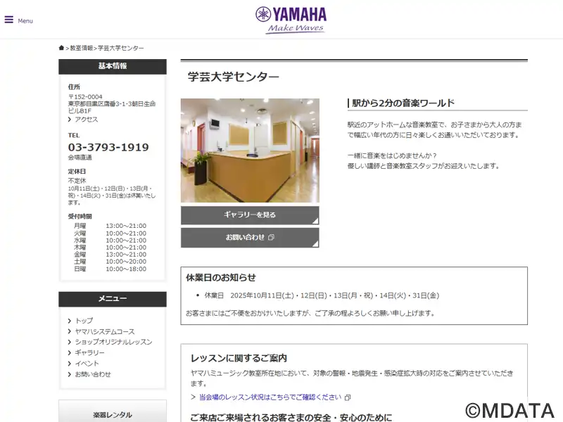 目黒区にある、ヤマハ認定講師による共通テキスト、カリキュラムでレッスンを行うレッスンセンター。音楽を通してこころを育てる「ヤマハ音楽教室」と、大人の方にぴったりの音楽の習い事「大人のヤマハ音楽教室」を開講している。ギター、エレクトーン、ピアノ、弦楽器、打楽器、歌、管楽器など多くのコースを用意している。懐かしのジャパニーズポップスを生演奏で一緒に歌う「歌うおとな倶楽部」等のオリジナルプログラムも開講している。