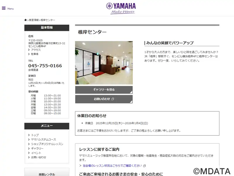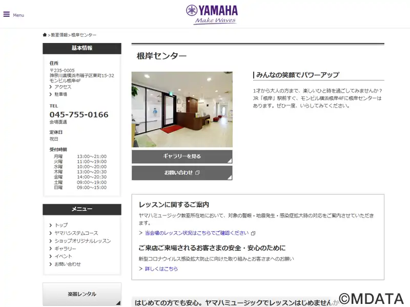 横浜市磯子区にあるヤマハ認定講師による共通テキスト、カリキュラムでレッスンを行うレッスンセンター。音楽を通してこころを育てる「ヤマハ音楽教室」と、大人の方にぴったりの音楽の習い事「大人のヤマハ音楽教室」のほか「ヤマハ英語教室」「歌って踊れる青春ポップス」を開講。オリジナルコースとしてピアノ、エレクトーン、健康と音楽のウェルネスプログラムを用意している。JR根岸駅前すぐ、バスターミナル前。