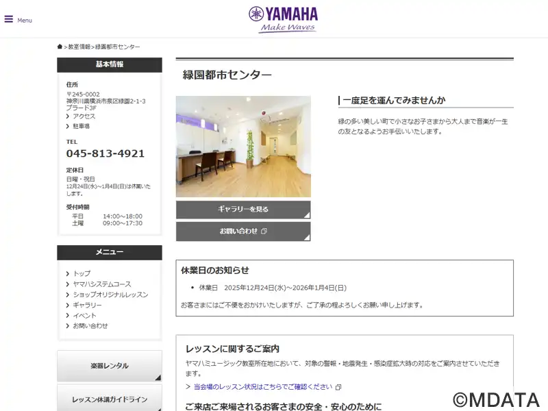 横浜市泉区にあるヤマハ認定講師による共通テキスト、カリキュラムでレッスンを行うレッスンセンター。緑の多い美しい町で、音楽のある心豊かな暮らしを提案する。音楽を通してこころを育てる「ヤマハ音楽教室」と、大人の方にぴったりの音楽の習い事「大人のヤマハ音楽教室」を開講。オリジナルコースとしてピアノ、エレクトーン、管楽器、フルート、オカリナのコースも用意している。相鉄線緑園都市駅から徒歩すぐ。