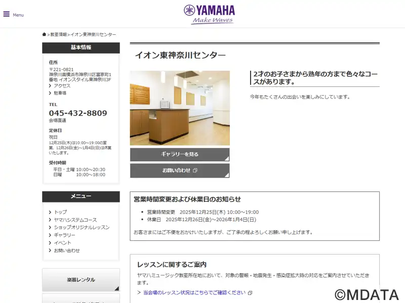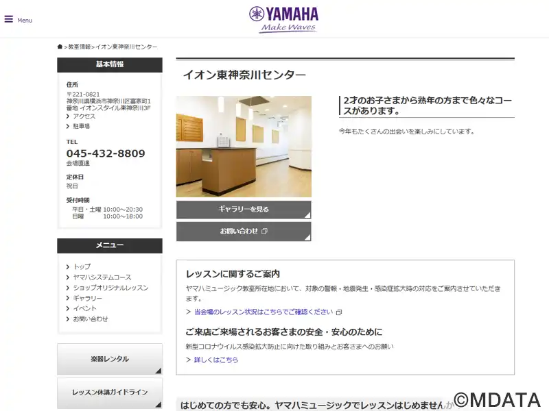 横浜市神奈川区にあるヤマハ認定講師による共通テキスト、カリキュラムでレッスンを行うレッスンセンター。音楽を通してこころを育てる「ヤマハ音楽教室」と、大人の方にぴったりの音楽の習い事「大人のヤマハ音楽教室」を開講。オリジナルコースとしてピアノ、エレクトーン、サックス、フルート、オカリナ、バイオリンのコースなど、二歳幼児から熟年向けまでの色々なコースを用意している。イオンスタイル東神奈川店3階。