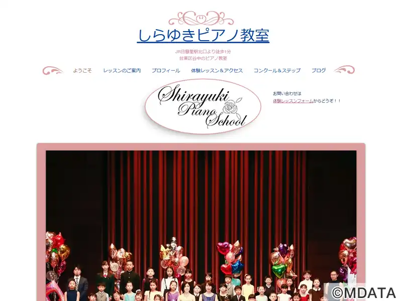 日暮里駅駅西口徒歩1分、台東区谷中にあるピアノ教室。本橋ゆき子氏(上野学園大学音楽学部器楽学科卒)が主宰。幼児から大人まで幅広い年齢層を対象に丁寧に指導する。毎日コツコツと練習して小さな目標を達成し、ゴールに辿り着く達成感を学ぶことで、ピアノを通して「心を強くし、困難に負けない精神力を身につける」ことをモットーに、ピアノを愛する人たちが集う。コンクールへのチャレンジをサポート、多くの生徒が入賞を果たす。