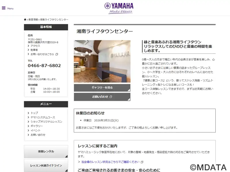 藤沢市にあるヤマハ認定講師による共通テキスト、カリキュラムでレッスンを行うレッスンセンター。幅広い年代を対象に、楽しい要素の詰まったグループレッスン、レベルに合わせた個人レッスンを提供。音楽を通してこころを育てる「ヤマハ音楽教室」と、大人の方にぴったりの音楽の習い事「大人のヤマハ音楽教室」を開講している。オリジナルコースとしてピアノ、エレクトーン、歌、踊りのコースも用意。ライフタウン中央バス停下車。