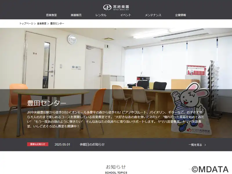 東京日野市にある宮地楽器のレッスンセンター。ヤマハミュージックリテイリングから運営を引き継ぎ2021年2月に開設。子どもから大人まで幅広い年齢層を対象に、ピアノ・エレクトーン・ギター・ウクレレ・バイオリン・フルートなど多彩な楽器コースを展開。ヤマハ音楽教室・ヤマハ英語教室のほか、いしど式そろばん教室も開講しており、音楽にとどまらない複合型の学習拠点。練習室のレンタルもあり、個人・グループ練習に対応。