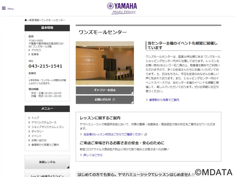 千葉市稲毛区にあるヤマハ認定講師による共通テキスト、カリキュラムでレッスンを行うレッスンセンター。音楽を通してこころを育てる「ヤマハ音楽教室」と、大人の方にぴったりの音楽の習い事「大人のヤマハ音楽教室」のほか「ヤマハ英語教室」「歌って踊れる青春ポップス」を開講している。オリジナルコースとしてピアノ、エレクトーン、歌、踊りのコースも用意している。ショッピングセンターワンズモール内3階。