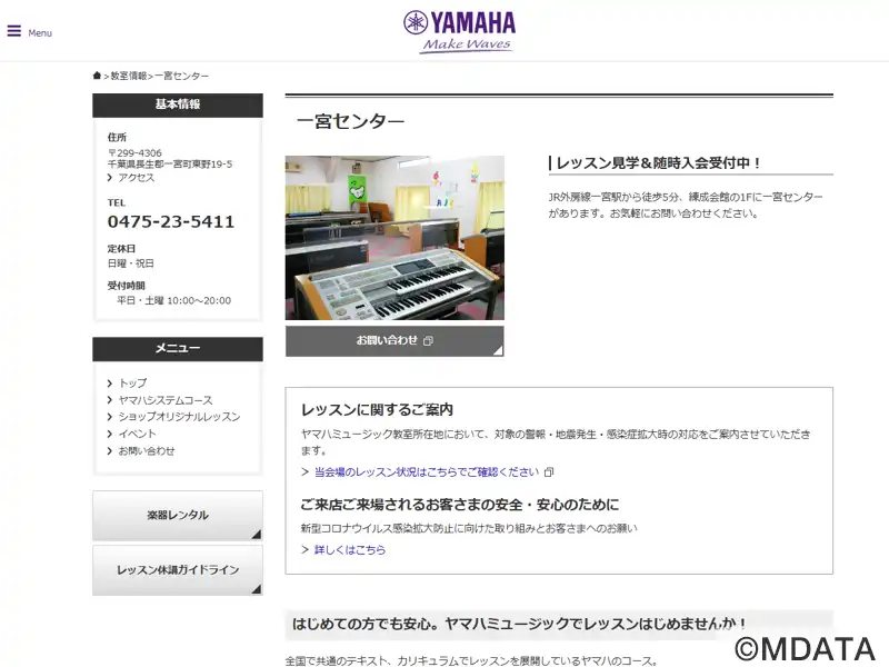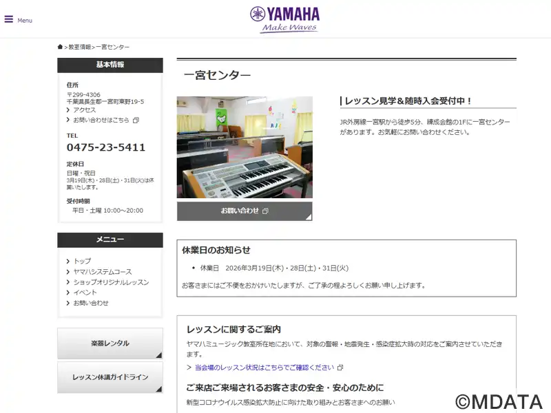 長生郡一宮町にある、自然豊かな環境に囲まれた地域密着型の音楽教室。ヤマハ認定講師による共通テキスト、カリキュラムでレッスンを行う、音楽を通してこころを育てる「ヤマハ音楽教室」を開講。また、オリジナルコースとしてのピアノコースも用意している。3歳児の「おんがくなかよしコース」では感受性や音感を育成し、幼児科コースでは「きく、うたう、ひく、よむ」を通して、創造性豊かな音楽表現力を養う。