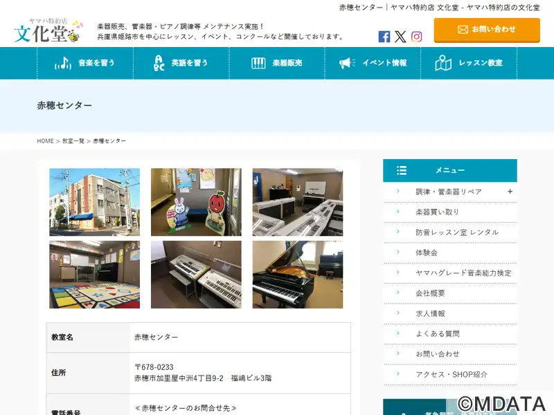 赤穂市にある文化堂のレッスンセンター。西播唯一のヤマハ音楽教室を運営する楽器店文化堂では、長年に渡るヤマハの音楽教室プログラムの長所を取り入れ、ベテラン講師による楽しいレッスンを行っている。ヤマハ認定講師による共通テキストとカリキュラムを用いた、子ども向けのピアノやエレクトーンレッスンの「ヤマハ音楽教室」や「ヤマハ英語教室」や、ピアノやエレクトーン、フルート、オカリナなどのオリジナルレッスンを開催。